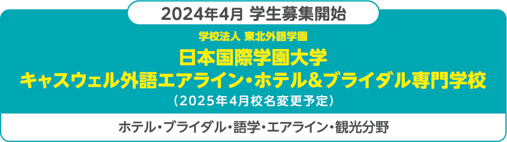 ※東北外語観光専門学校は2025年4月をもって校名を「日本国際学園大学 東北外語ビジネス専門学校」に変更いたしました。また、設置学科を改変し、一部の分野(語学・エアライン・観光)の職業教育を姉妹校「日本国際学園大学 キャスウェル外語エアライン・ホテル&ブライダル専門学校(2025年校名変更)」で行っております。