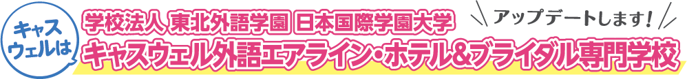 キャスウェルは、新しい時代を切り拓いていく心豊かなキャストを社会に送り出していくために、アップデートすることを決めました。創立78年の実績で信頼ある【東北外語観光専門学校(姉妹校)】の国際・語学・観光教育を【キャスウェル】に融合させ、新しい学びを提供していきます。2025年4月【日本国際学園大学 キャスウェル外語エアライン・ホテル&ブライダル専門学校】で【夢】実現に向けて共に歩いていこう!